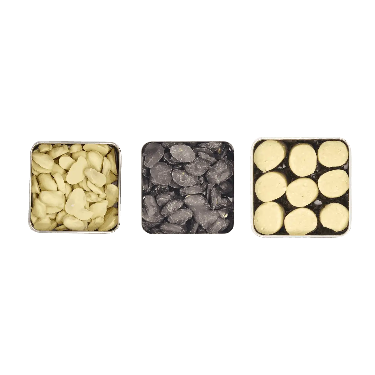 Türk Bademi, Kakao Kitlesi (70%), Kakao Yağı, Yağlı Süt Tozu, Vanilya, Vanilin, Bağlayıcı (Ayçiçek Lesitini), İçme Suyu, Pancar Şekeri, Sitrik Asit, Tartarik asit